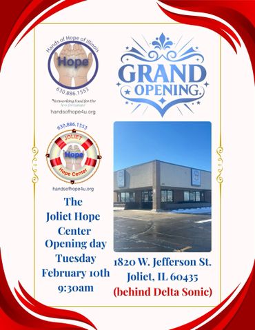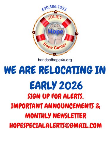 The Joliet Hope Center will be closing early today due to the excessive heat and air quality conditions. If you plan on coming in today 8/22/23, please do so before 5pm. We Will be closing at 3pm on Wed. & Thurs.